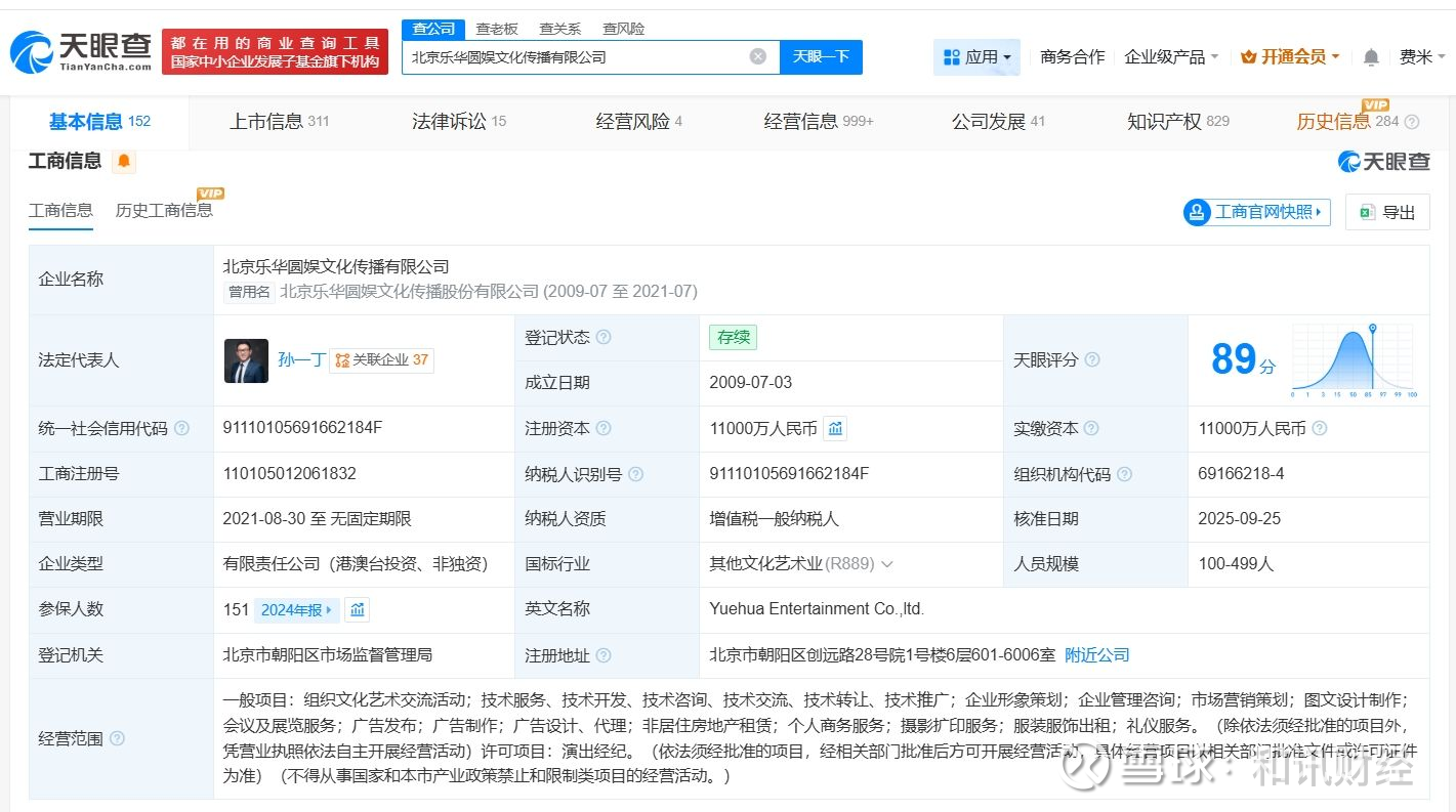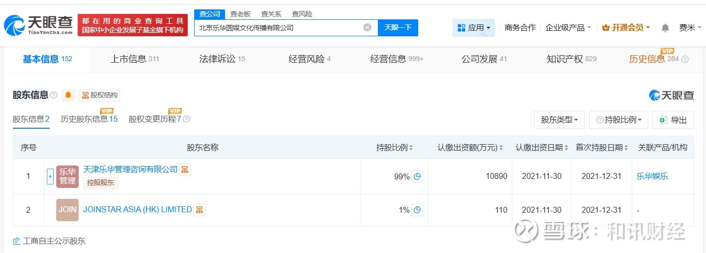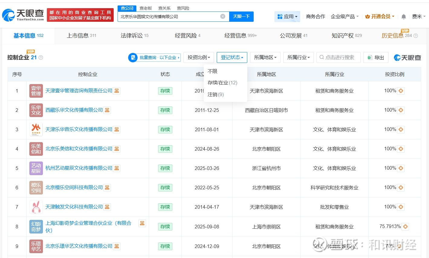 天眼查App显示,乐华娱乐关联公司北京乐华圆娱文化传播有限公司成立于2009年7月,法定代表人为孙一丁,注册资本1.1亿人民币,经营范围包括组织文化艺术交流活动、演出经纪、企业形象策划等,由天津乐华管理咨询有限公司、JOINSTAR ASIA (HK) LIMITED共同持股。控制企业信息显示,该公司控制企业21家,其中10余家企业处于存续状态,包括天津壹华管理咨询有限责任公司、西藏乐华文化传播有限公司等。