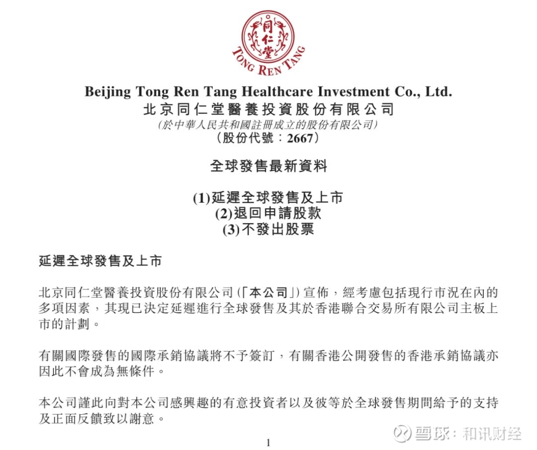 2026年3月27日,距离原定上市日仅剩3天,北京同仁堂(600085)医养投资股份有限公司(02667.HK)一纸公告宣布延迟全球发售及主板上市计划。认购资金即将启动全额退款流程,这场耗时近两年、历经四次递表的IPO之旅,在最后一刻再次按下了暂停键。