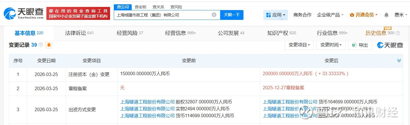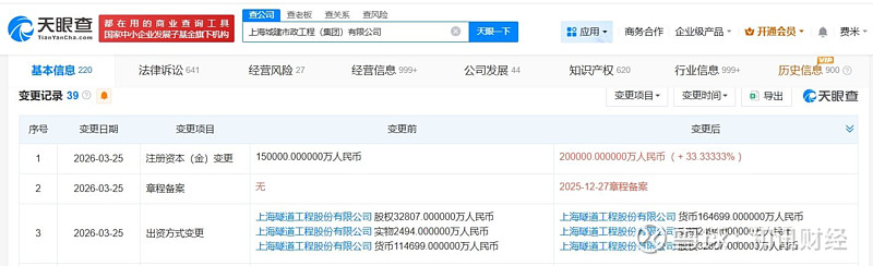天眼查App显示,近日,上海城建市政工程(集团)有限公司发生工商变更,注册资本由15亿人民币增至20亿人民币,增幅约33%。