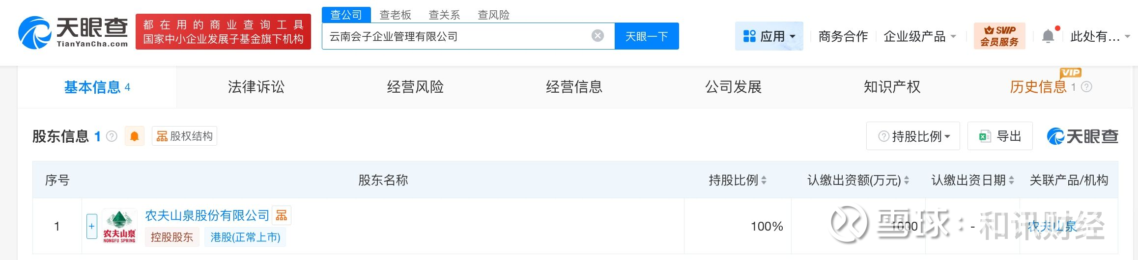 天眼查工商信息显示,近日,云南会子企业管理有限公司成立,法定代表人为饶明红,注册资本1000万人民币,经营范围包括企业总部管理、企业管理、食品销售、供应链管理服务等。股东信息显示,该公司由农夫山泉(09633.HK)全资持股。