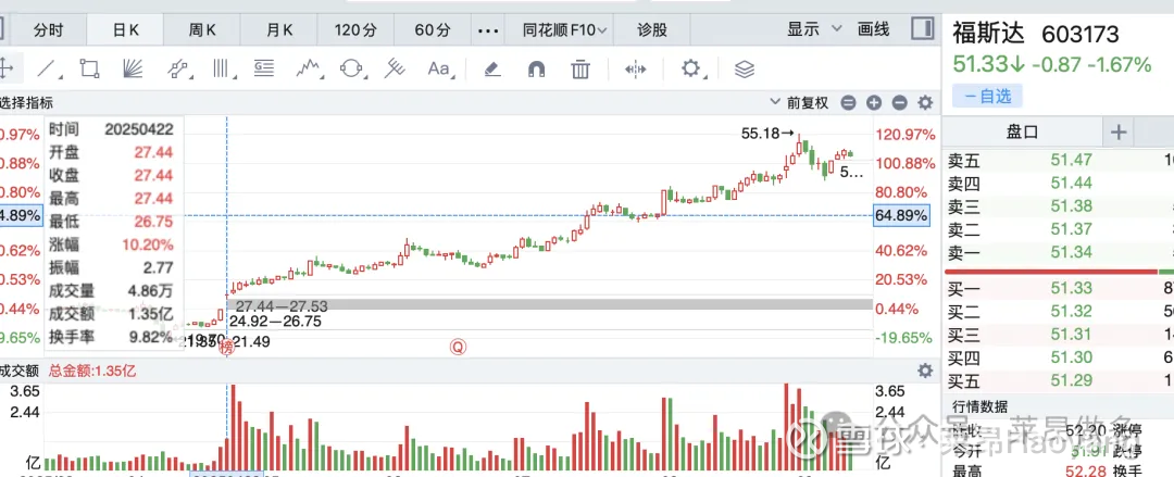 这票自4月21日一季报发布后走出了斜30度上涨的走势,截止今日涨幅翻倍有余,另一只行业龙头杭氧股份同期只涨了28%,另一只中泰股份涨了36%。说明行业整体在复苏,但福斯达有自己的阿尔法了。