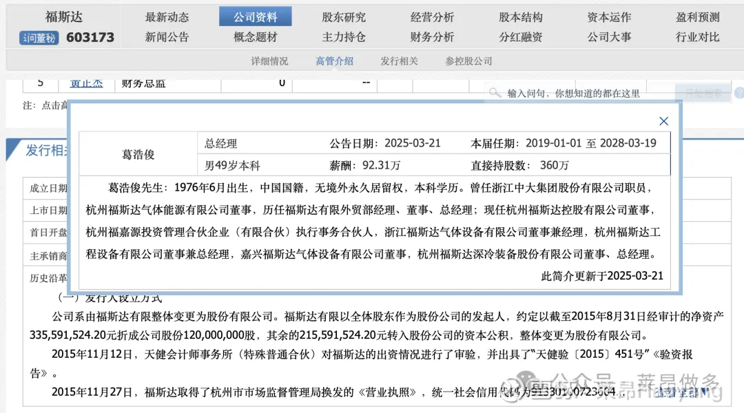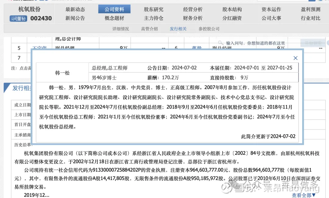 写到这里,我的第一反应是看下两个公司大股东和高管团队,果然:福斯达是民企,杭氧是国企(杭州国资委大股东)。其中,福斯达的董事长是厂里业务一线,现在年纪大了,而杭氧的董事长是体制内出身。再截图看一下执行层面的一把手,即总经理:
