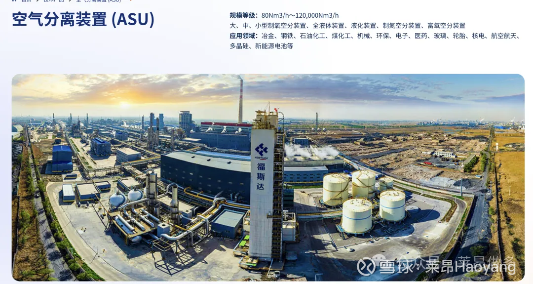 福斯达专业从事各类深冷技术工艺的开发及深冷装备的设计、制造和销售,为客户提供深冷系统整体解决方案。深冷技术工艺系在低温环境中(通常为-60℃~-269℃)对空气、天然气、合成气、化工尾气、烯烃等介质进行液化、净化或分离的工艺方法。公司产品主要包括空气分离设备、天然气处理及液化装置、绕管式换热器、化工冷箱和低温储罐等深冷装备。例如官网截图: