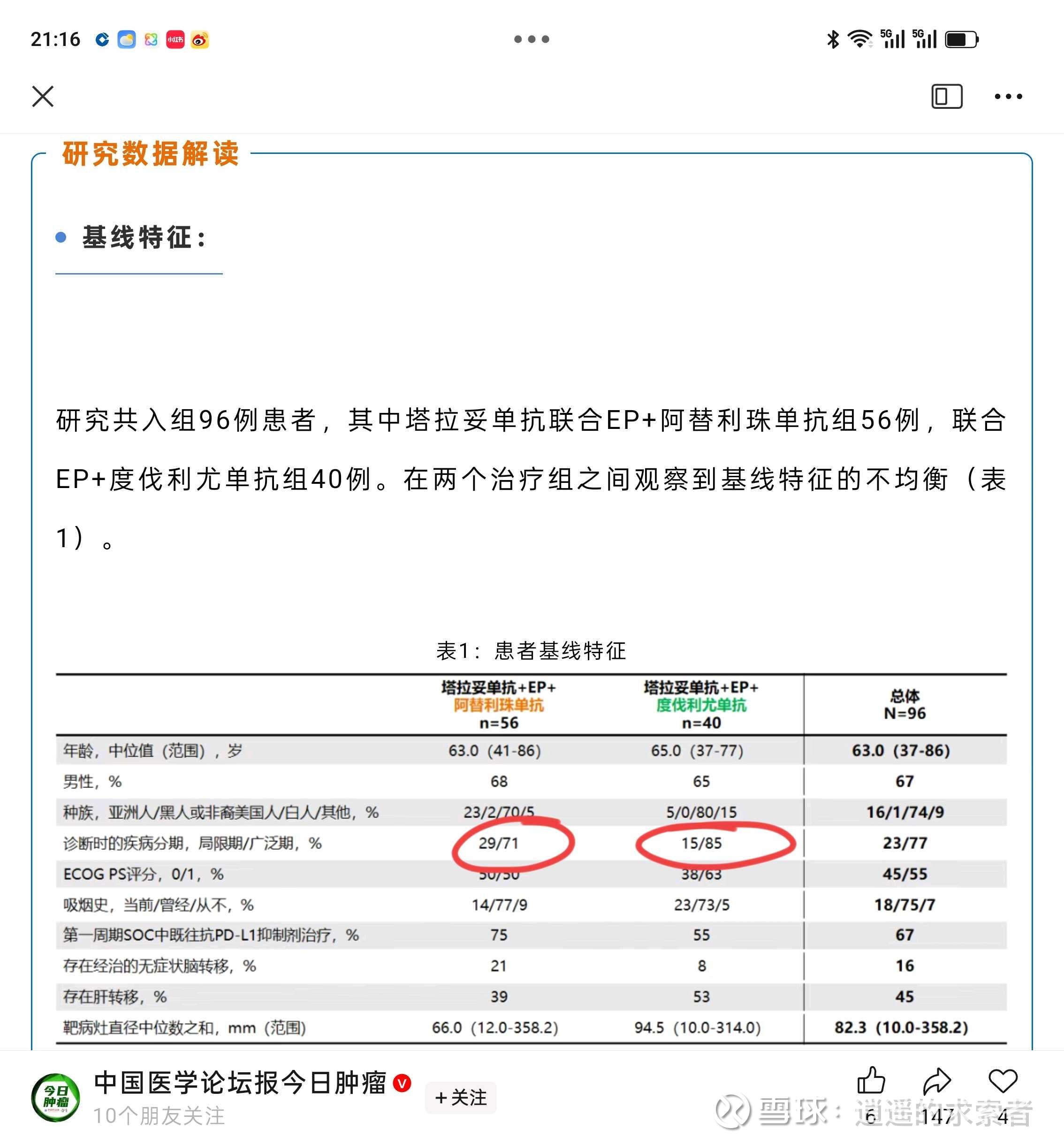很不好意思,之前看文档不够仔细,没注意到塔拉妥联合阿替丽珠和度伐利尤两组的基线存在重大差异——局限期病人占比差了一倍,这应该是导致二者pfs曲线(红线和绿线)有很大差异的主要原因(阿替丽珠和度伐利尤注册临床的pfs图和数据基本类似,在国内多个临床数据中也得到了复现,再次强调小肺这病专治各种不服,广泛期病人基线天然的一致性高,天然的最适合跨临床比较)。