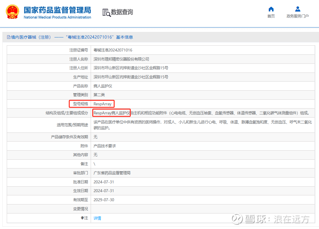 首先,上周无意中搜了NMPA(国家食药监局)的医疗器械注册,理邦在今年7月31日拿到了型号为RespArray的病人监护仪注册。