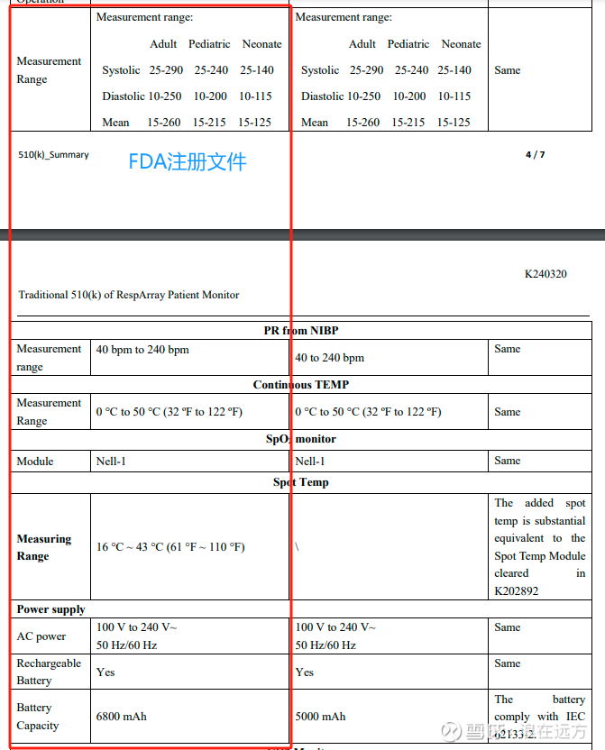 还有一些其他材料内容,比如美敦力官网可以下载RespArray监护仪的使用说明,其中有监护仪的一些硬件指标和检测指标范围,与FDA注册文件里的完全一致。在此仅提供图片,有兴趣可以自行对比。