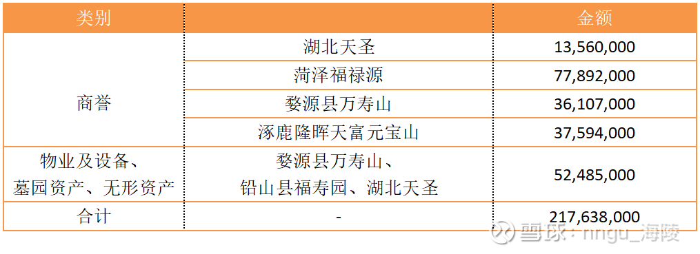 1. 商誉减值:对湖北天圣公墓有限公司、菏泽福禄源公墓管理有限公司、婺源县万寿山陵园有限公司及涿鹿隆晖天富元宝山开发管理有限公司分别减值人民币13,560,000元、77,892,000元、36,107,000元及37,594,000元。