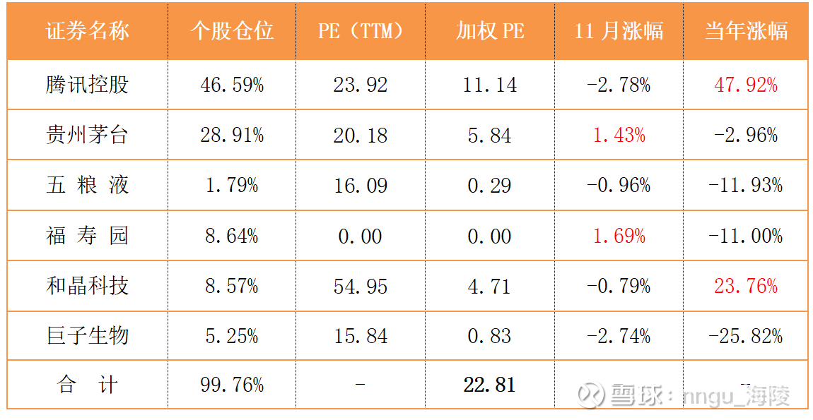 11月份卖出部分和晶科技,买入巨资生物,同时叠加重仓股腾讯股价的下跌,持仓组合加权PE(TTM)= 22.81,PE(TTM)环比下降约10%。
