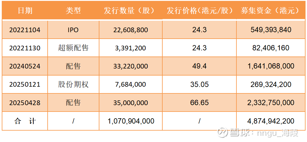 2022年-2025年期间,公司通过IPO、配售以及员工期权行权,累计发行股份10.71亿股,累计募集资金【48.75】亿港元(包含各类交易和服务费用)。其中: