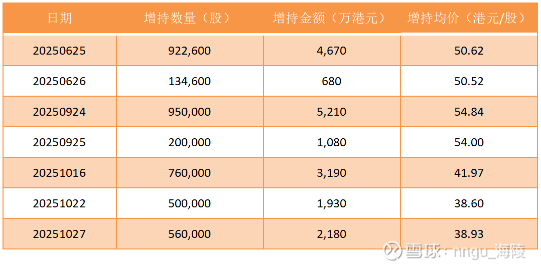 截至12月10日,增持承诺6个月期满,公司未再披露新的增持消息,因此本轮大股东增值最终结果就是10月27日的公告信息,累计增持2.002亿港元,增持4,226,600股,增持均价【47.37】港元/股。