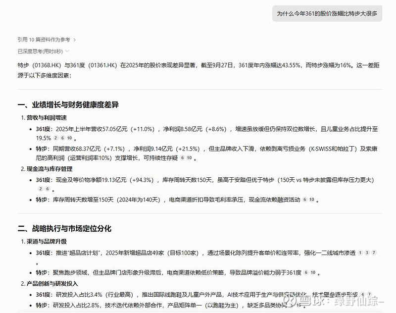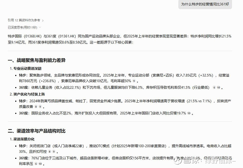$特步国际(01368)$ $361度(01361)$ 问了deepseek两个问题,一个倾向于对361有利,一个对特步有利,结果deepseek都给出了比较自洽的逻辑。可能的原因是,AI的主要功能是基于假设,检索信息流并形成逻辑,而且假设越抽象,逻辑和结论往往越模糊。至于这种假设是不是符合客观事实,这种逻辑能不能预测事物的发展,要靠不停地提出各种假设、整合各种信息和逻辑,来帮助人形成判断。所以AI时代,问题可能比答案更重要,多提问题,少下结论。