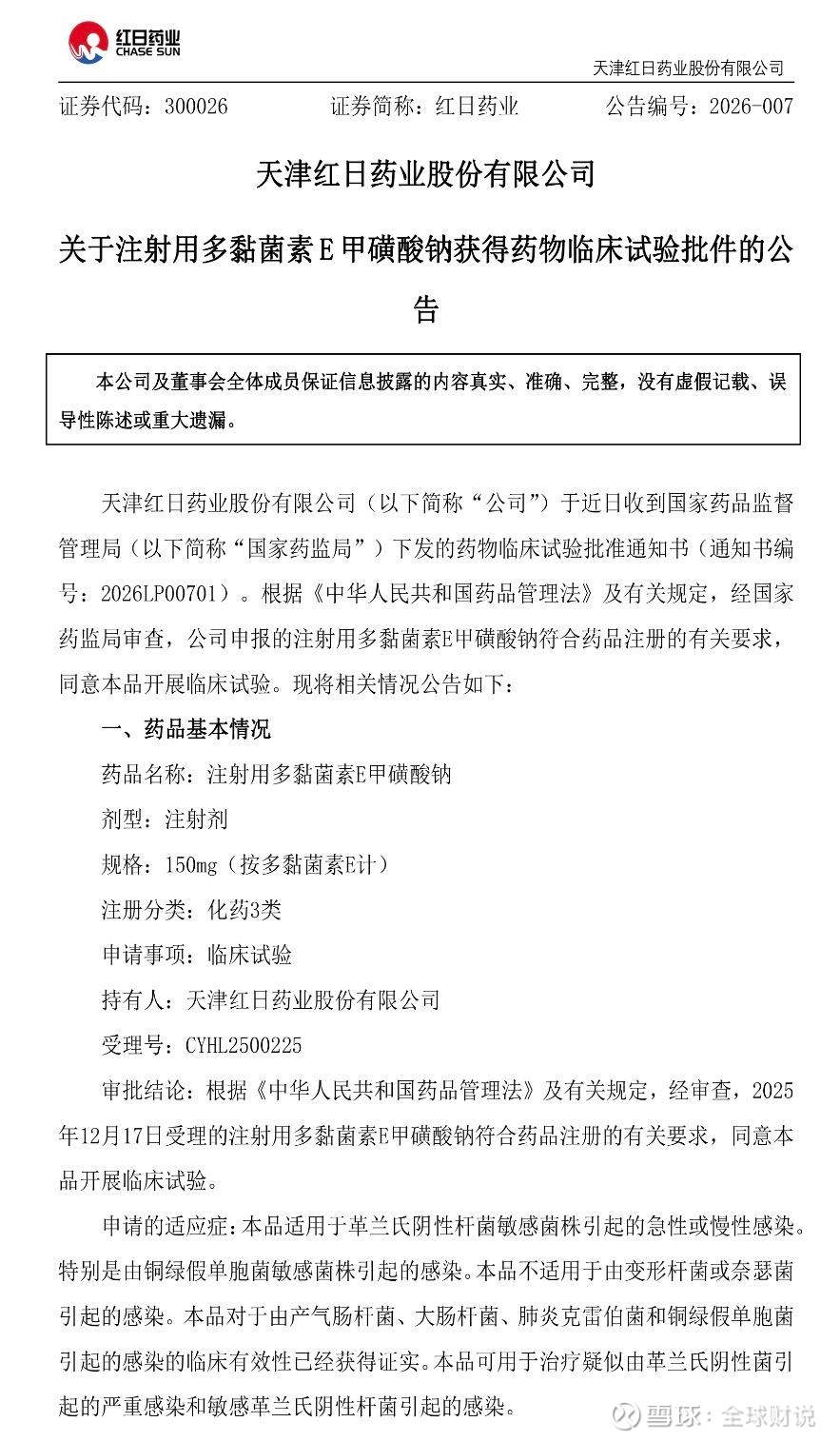 2026年3月20日,红日药业(300026.SZ)公告称,注射用多黏菌素E甲磺酸钠获国家药监局临床试验批准(编号:2026LP00701)。