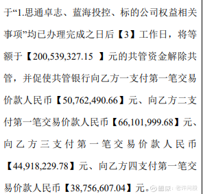 乙方们收到无异议函3个工作日完成工商资料变更(我的理解是必须以中登的信息为准),之后3个工作日,甲方促使共管银行向乙方们支付第一笔价款。