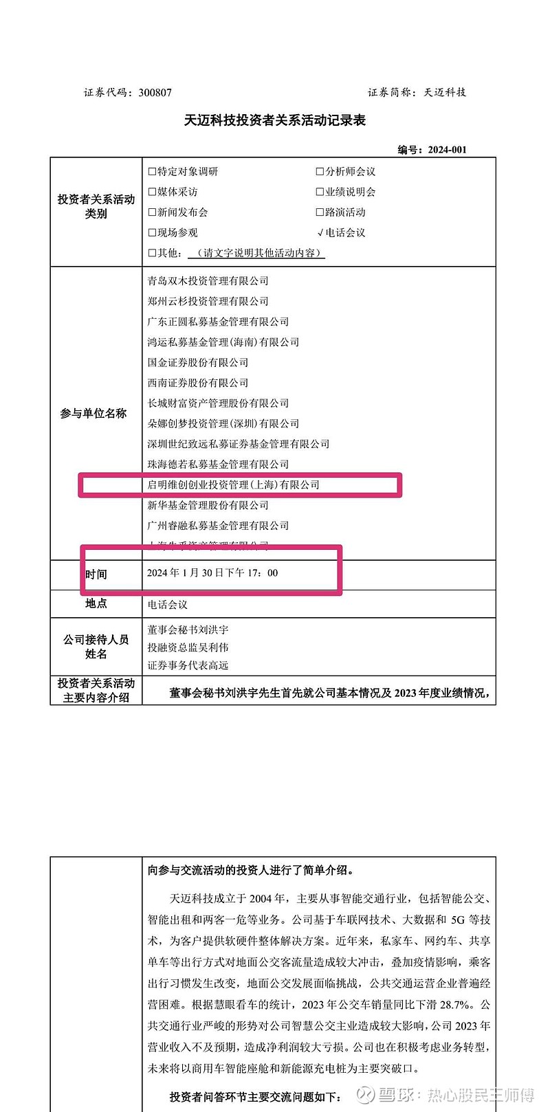 $天迈科技(SZ300807)$假期翻了翻天迈之前的公告,发现早在2024年1月(两年前)启明就参加天迈科技的电话会议,思考有如下2点:1.收购控制权绝非一时兴起,而是早有准备,并深刻把握了“并购六条”后政策窗口期,稳妥靠谱2.与简单财务投资不同,本次控制权收购后产业协同助力业务发展或资源资产注入,想必早已有规划和计划,静待花开