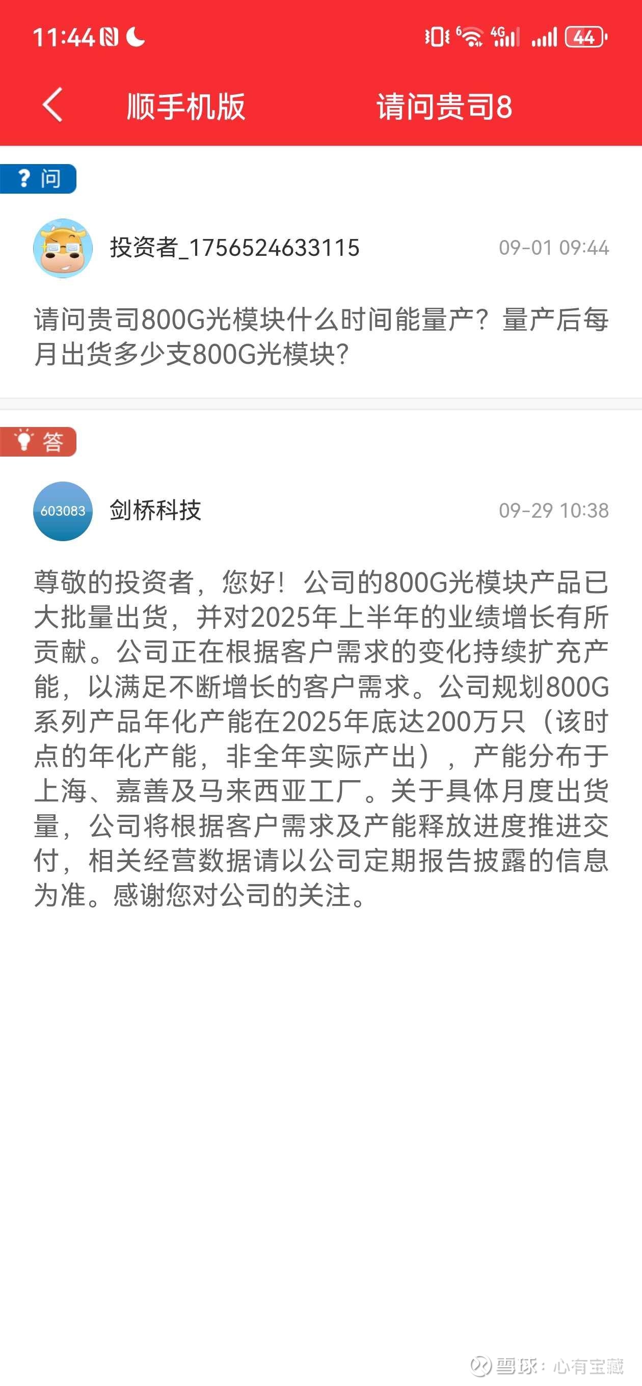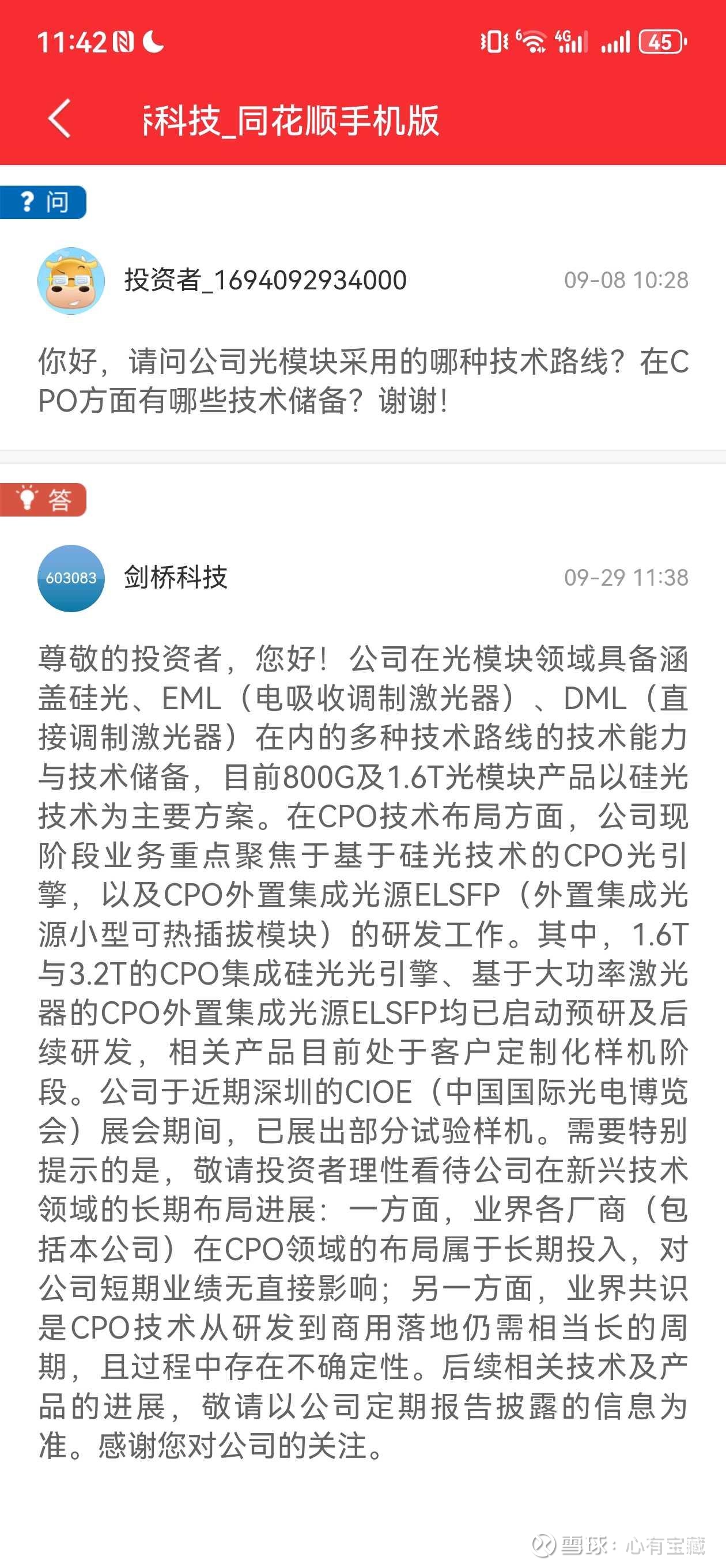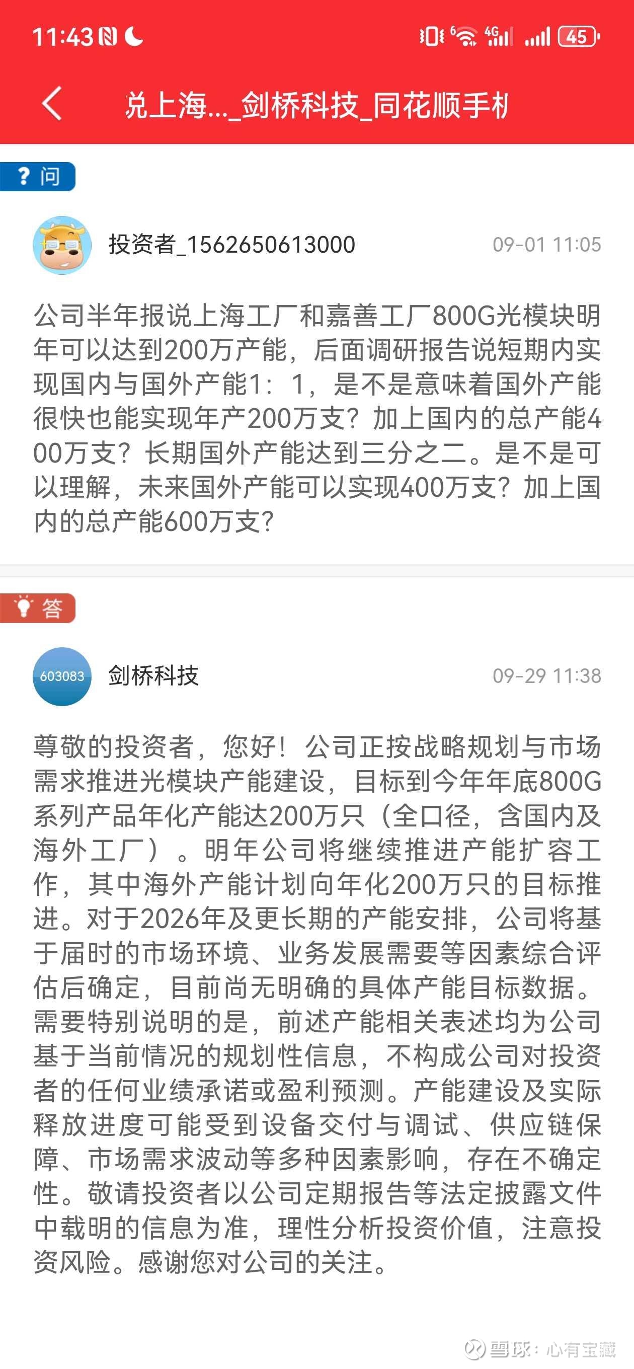 非常喜欢剑桥科技这种态度,开诚布公,这是我目前为止看到的唯一一个把明年产能(800G光模块300万支+)说的清清楚楚明明白白的股票,而且把行业的风险也说明白了!CPO技术从研发到落地还有相当长的周期和不确定性……活该这段时间一直领涨,期待明天和能科科技一起携手共进,一个是硬件龙头,一个是软件龙头,齐头并进,相辅相成$剑桥科技(SH603083)$ $能科科技(SH603859)$