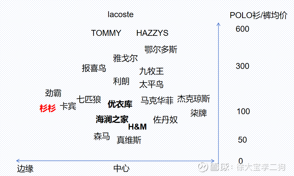 下图是男装品牌的矩阵 杉杉这属于竞争最激烈的区域边缘.图里所有品牌都比他粉丝多.