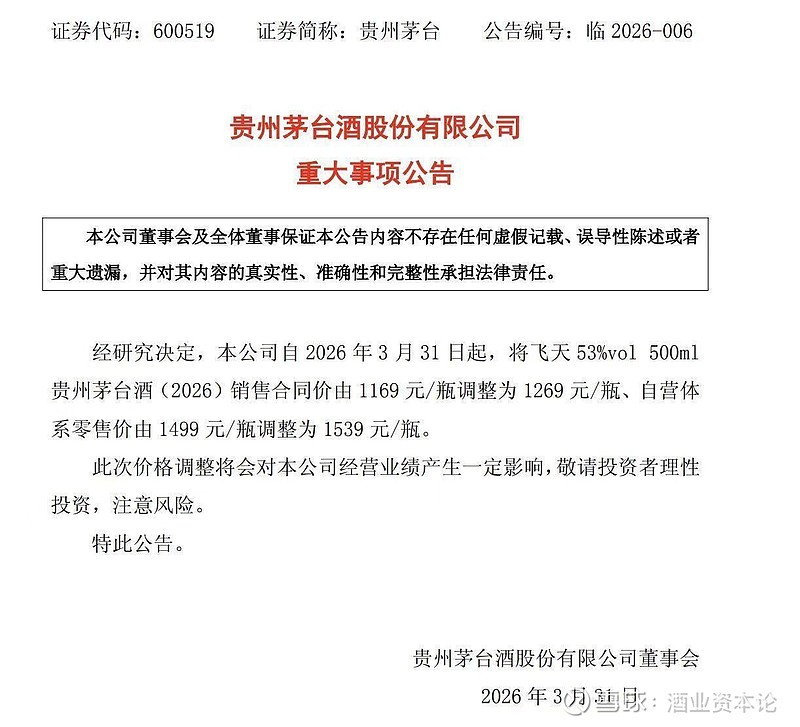 3月30日,贵州茅台(600519)一纸调价通知,将53度500ml飞天茅台酒出厂价从1169元上调至1269元,自营零售价同步调至1539元。