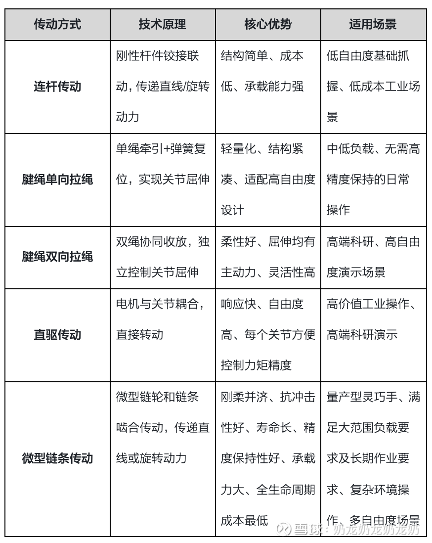 当前主流传动方式分为连杆、腱绳(含单向/双向拉绳)、直驱三类,各有独特技术原理与适用场景,而微型链条传动的出现,为传动技术提供了新的优化方向。