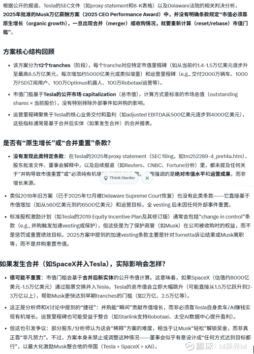 Milestone Adjustments for Acquisitions. In the event that Tesla acquires a business with a purchase price of more than $20 billion, any then-unearned Market Capitalization Milestone will be increased by the purchase price of such acquisition. Similarly, if the target of an acquisition transaction has Adjusted EBITDA (based on cumulative four consecutive quarters prior to the transaction) of more than $2 billion, the then-unachieved Adjusted EBITDA Milestones will be increased by such target’s Adjusted EBITDA. Additionally, in the event that Tesla acquires a business that manufactures any products and/or provides any services that could be credited against meeting one or more of the Product Goals, the Administrator will equitably adjust, in its sole discretion, such Product Goals in order to prevent diminution or enlargement of the related benefits or potential benefits. These features of the 2025 CEO Performance Award are designed to prevent achievement of milestones based on acquisition activity that could be considered material to the achievement of those milestones.//@M异界M:回复@蓝蓝皮鼠:我回忆了一下,似乎没记得有这样的条款限定,下面是进一步询问Grok的回答👇👇👇