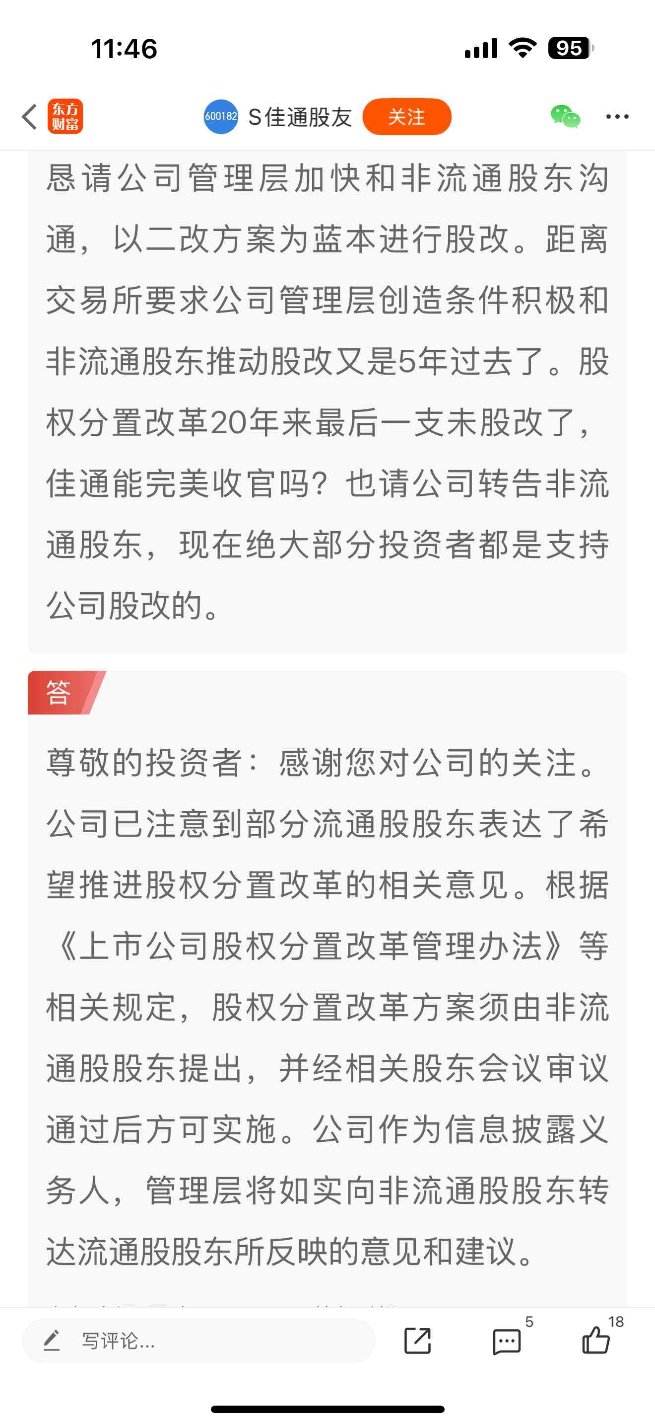 $S佳通(SH600182)$ 这自问自答….股改预期太强了吧?一改往日冷冰冰的“感谢您的建议”,这么多年来首次正面回复股改相关问题。中国股市20年股权分置改革即将大结局了吗?20年的等待,算上时间成本…….连咱这个销户之人都忍不住爬起来扶墙看看。只要有股改,就算一股不送咱也赞成,熬不住了。