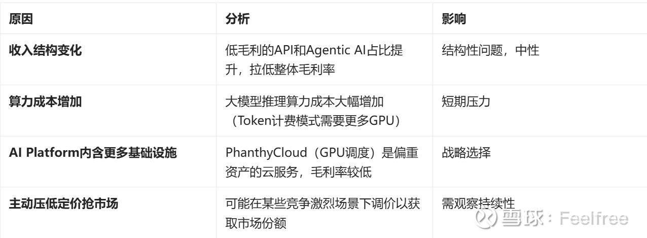 中性判断: • 毛利率从42.7%→34.8%是战略性下降,而非竞争力恶化 • AI Platform+PaaS天然毛利率低于纯软件SaaS(算力成本占比较高) • 如果毛利率34.8%能换来收入+35.6%和扭亏,这个交换是值得的 • FY2026需要观察毛利率是否稳定(目标:维持35%)