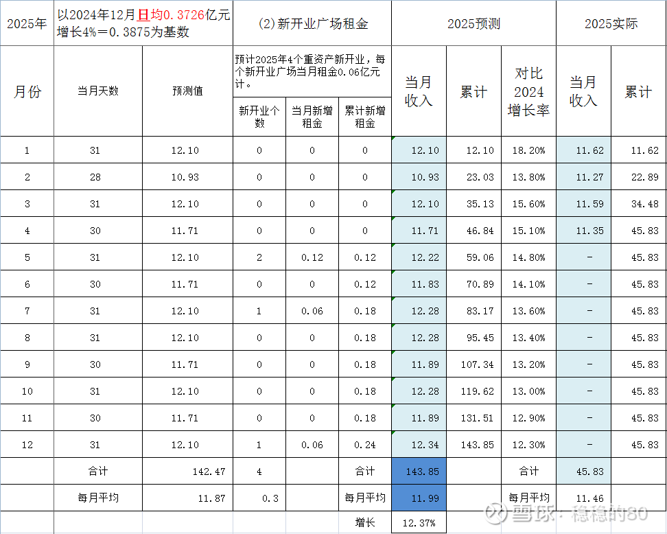 2.预计2025年4个重资产新开业,按每个新开业广场当月租金0.06亿元计。