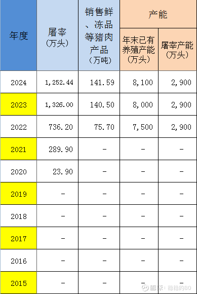 2022年就有养殖7500万头的产能,2024年还是只有8100万头;现在又不务正业,搞什么屠宰,而且不杀鸡不杀鸭只会杀猪,2024年屠宰1252万头,比2023年还减少,业绩真不好看。