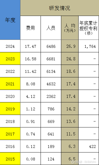 10年累计投入研发60.64亿,2024年底累计授权专利仅仅1764项,投入产出效率太低。中间很多年带着遮羞布过街,公司都不好意思列出授权专利有多少,有高达6486名的科研人员,这些专利四个研发人不够分一项,严重怀疑其中1000人上班在打掼蛋,800人在搓麻将,1200人在刷抖音,还有1000人在摸鱼。剩下2486人,是1000个关系户领空饷,1000人轮流请假,400人研究买别人的啥专利,剩下86人做点后勤……