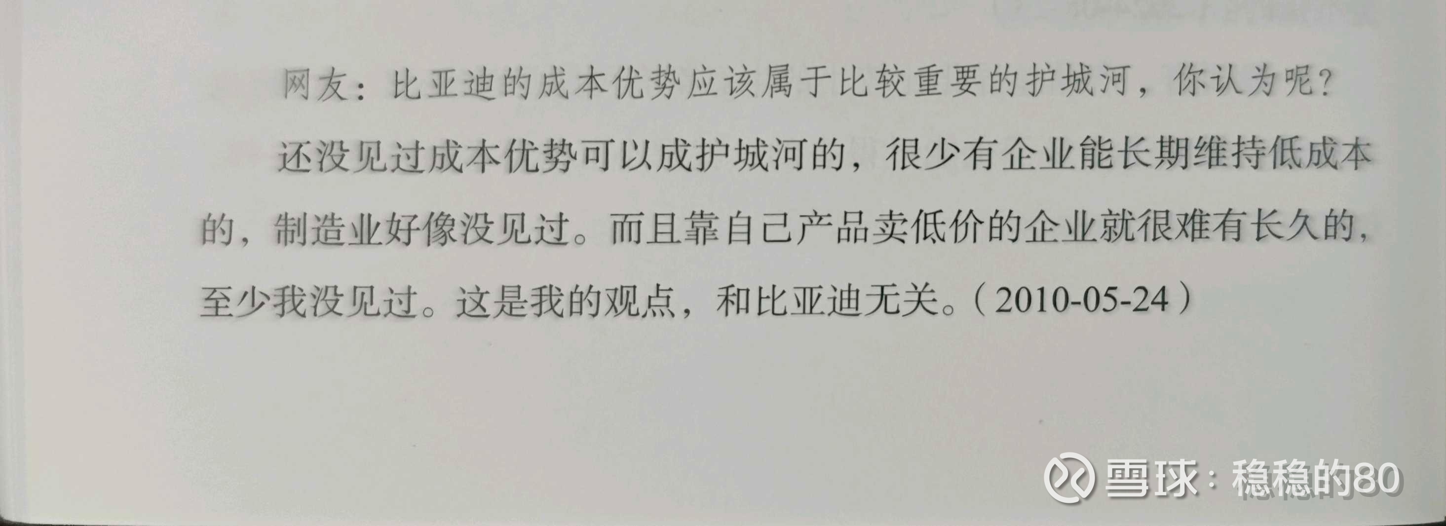 上面是段永平对成本优势的看法。