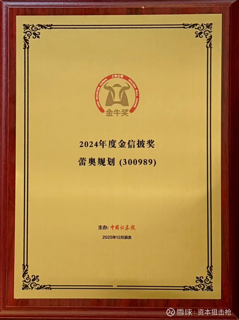 12月6日,由中国证券报主办的上市公司金牛奖“金信披奖”颁奖典礼在安徽合肥隆重举行,蕾奥规划(300989)凭借在信息披露、规范运作、投资者关系管理等方面的卓越表现,荣获上市公司金牛奖“金信披奖”,彰显了权威机构与市场对公司治理水平的高度认可。