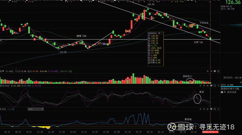 不过,已经跌出了黄金坑,股价目前来到下降通道下沿及前期W底颈线一带,这里技术上有较强支撑,如果后市出现“放量+阳包阴红K+KD金叉” 短线企稳信号,应该有做超跌反弹机会
