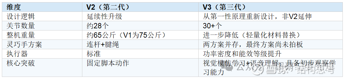 ① V3不是V2的改款,而是从第一性原理重新设计。关节数从28个增加到30+,整机重量继续从V2的65公斤下降,灵巧手方案在「连杆+腱绳」vs「微型电机模组」两者间仍未最终拍板。本月底或下月初正式亮相,首次全面展示实物+现场语音演示