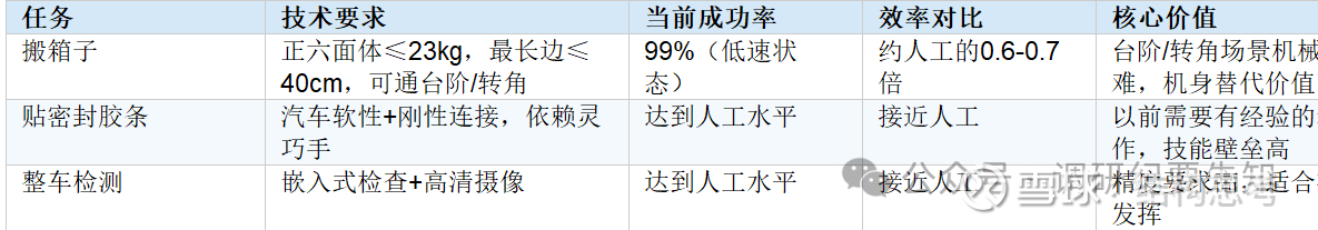 ② 工厂三大任务实测已达人工水平:搬箱子(99%成功率,速度约人工0.6-0.7倍)、贴密封胶条、整车检测。速度慢是唯一短板,任务质量已无问题