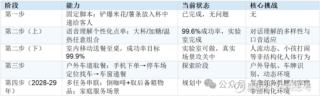 ③ AI能力进化路线图清晰:爆米花固定脚本(已完成)→语音理解个性化点单(99.6%成功率)→室内移动送餐(实验室OK,真实场景攻关中)→户外车道取餐(探索阶段)→2028-29年多任务家庭服务