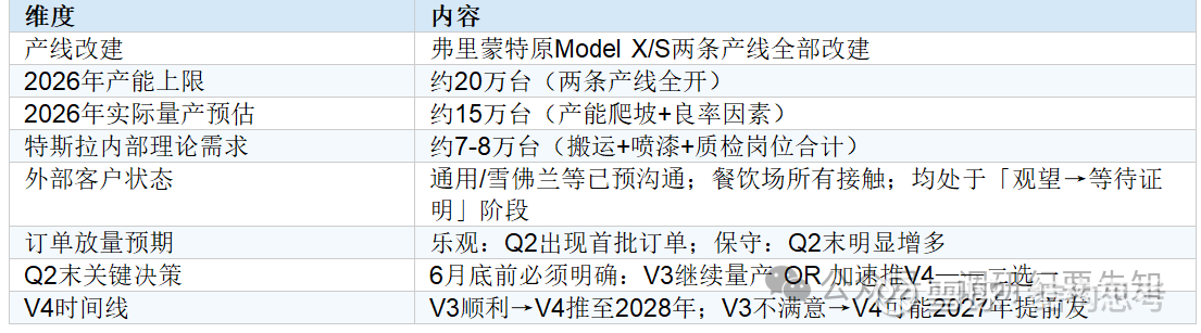 ④ 2026年量产目标约15万台。弗里蒙特两条产线全部改建,产能上限20万台。物料成本当前约4.3万美元/台,规模化目标降至2万美元——北美搬运工年薪约2万美元,约一年多即可回本