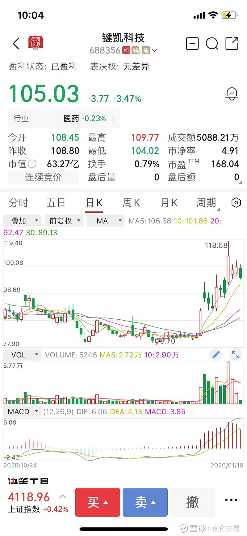 早上-4的时候走了,结果又拉回来了,刚开始以为会跌到60,没想到80的时候呢,反弹的40个点,冲进去以为能长一倍,结果两天跌了四个点,以为还能跌的时候又拿回去了,这只股真的太难操作了,只适合低买高卖,在市场将要草医疗的时候,可以再低点买进去,特别关注为伟思医疗跟他关系比较大一点,在大涨的时候再卖出这样子做t才能够回本