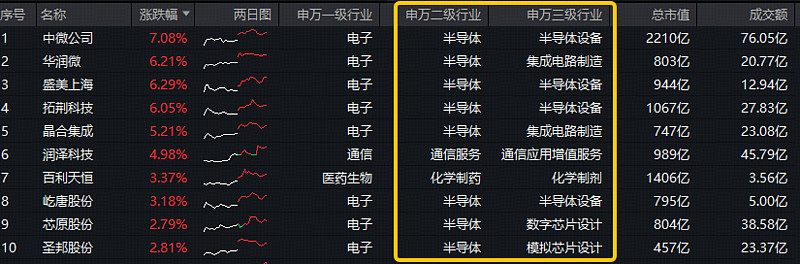 成份股方面,半导体龙头显著领涨,中微公司涨超7%创历史新高,华润微、盛美上海、拓荆科技涨逾6%,晶合集成涨超5%,芯原股份、圣邦股份等个股跟涨。