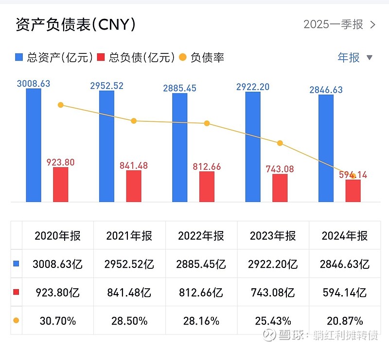 从24年年报的数据看,整体负债率低至20.87%,2847亿的总资产包含102亿的货币资金、2144亿的固定资产以及576亿的无形资产,594亿的总负债主要是不到530亿的有息负债,这种资产负债表一看就非常舒服。