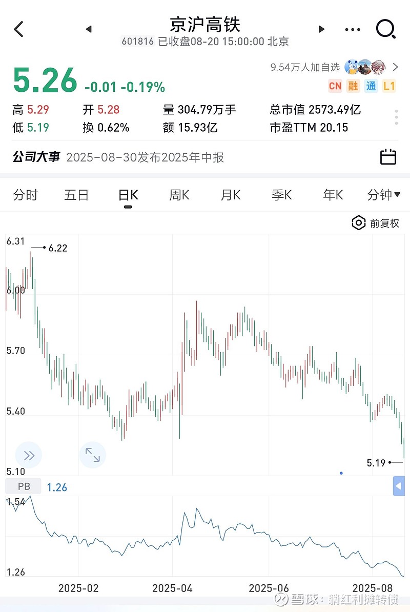当前京沪高铁的市净率是1.26倍,以其真实的盈利能力而言这个估值不算贵,但也没有到一个非常便宜的地步,过去几年特殊时期京沪曾经出现过1.15倍PB的最低估值,我觉得1.20倍估值是一个比较理想的介入点,考虑到其稳定的业务模式、强劲的现金流以及干净的资产负债表,我愿意用小幅高于净资产的价格成为这家公司的股东。$京沪高铁(SH601816)$ $大秦铁路(SH601006)$ $宁沪高速(SH600377)$