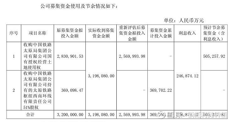 “截至2025年6月30日,公司募集资金专户余额为人民币307.53亿元,支付中国铁路太原局集团有限公司国有授权经营土地使用权交易总价款257.00亿元(含税)后,预计节余募集资金不低于50.53亿元(含利息收入),公司拟将上述节余募集资金(实际金额以资金转出当日专户余额为准)永久补充流动资金,用于公司日常生产经营活动。”