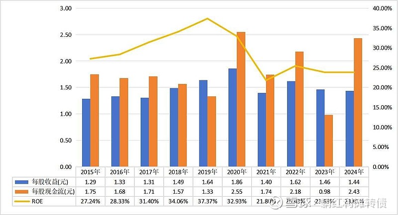 1、每股收益增速比较慢,总增速仅为11.63%,但是每股收益相对稳定,几次净利润的下滑都在合理范围内,相比每股收益的增速,每股现金流的增速数据要更好一些,过去十年的增长达到了38.86%,不过波动要比净利润大不少;