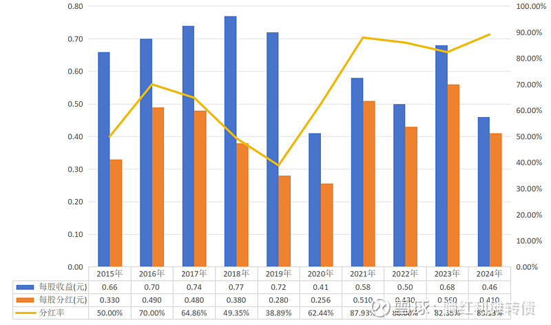 1、近十年每股分红与分红率数据: