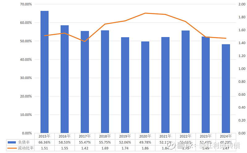 1、近十年负债率与流动比率数据:
