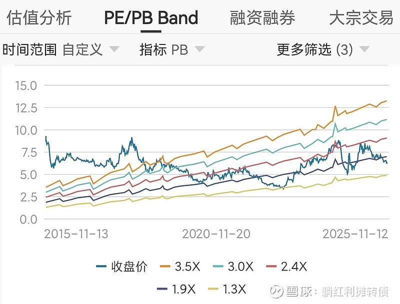 当前市场给海澜之家开出的报价是14.43倍的市盈率、1.69倍的市净率以及6.46%的股息率,用格派的视角来看,每一块钱海澜之家股票对应着0.069元净利润、0.592元净资产以及0.065元分红,以格派的保守眼光来看,这个估值不算贵,从历史数据来看,当前海澜的估值算是中等偏低吧,下图是海澜近十年的的PB Band图: