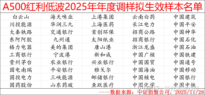 上周五(11月28日),中证指数公司公布了A股系列指数的样本定期调整方案,本次调整方案将于12月12日收市后正式生效。样本调整是指数的长期生命力来源,尤其是对以红利因子为核心的红利类指数而言,下面就跟随躺师傅的视角来看看今年的红利新贵——A500红利低波指数12月的样本调整情况吧~