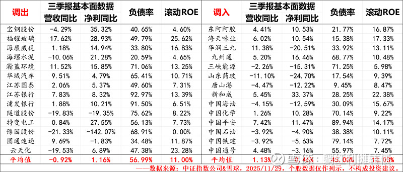 从2025年三季报数据看,调入样本的整体基本面是要略好于调出样本,调入样本的平均营收增速(1.13% VS -0.92%)、负债率(45.00% VS 56.99%)、ROE(12.03% VS 11.00%)都要好于调出的样本,不过净利润增速(-0.46% VS -1.16%)要略差点。
