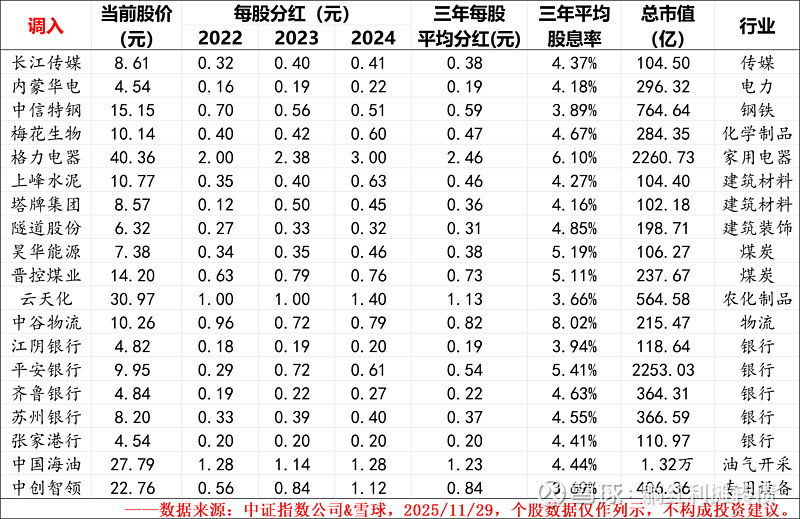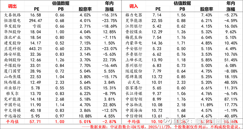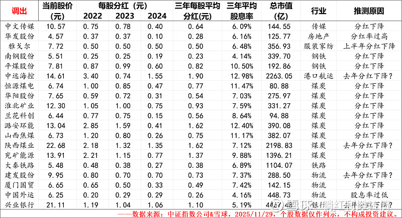 2、中远海控、陕西煤业、建发股份、兴业银行这4只样本24年的分红并没有下降、估值也比较低,但是依旧被调出了指数,这4只样本的共同点是23年分红相对22年分红下降了,个人猜测是因为去年样本调整的比较多没轮到这几只样本,所以滞留到今年才被调出?