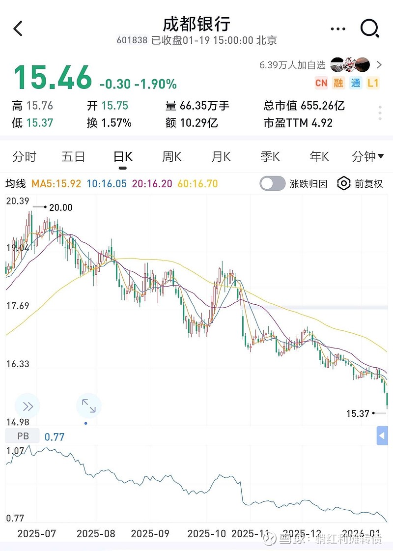 去年7月初以来,成银就陷入了跌跌不休的状态,当前已经从前期20元的高点一路跌到了15.46元,回撤达到了22.70%。当前成银5倍不到的市盈率其实挺便宜,5.76%的股息率也比较让人满意,而且个人觉得其基本面还是可圈可点的,盈利能力强、成长性良好、资产质量较好、拨备储备充足都是显而易见的优点,唯一不太好的地方就是核心资本比较弱,总是需要融资来解决发展难题,实际上躺师傅关注的另外两家苏银、杭银都和成银有点像,而且共同点都是过去半年跌跌不休,这反倒说明了这波下跌的动力主要来自于资金面而非基本面。