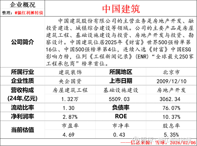 总的来看,中国建筑是一家盈利能力强、利润含金量很低、股东回报稳定、资产负债表不太健康的核心央企,虽然行业确实是苦了些,但是中建依旧取得了不错的经营效果,至少是要大幅好于其他基建央企,算得上是“沙漠之花”了。