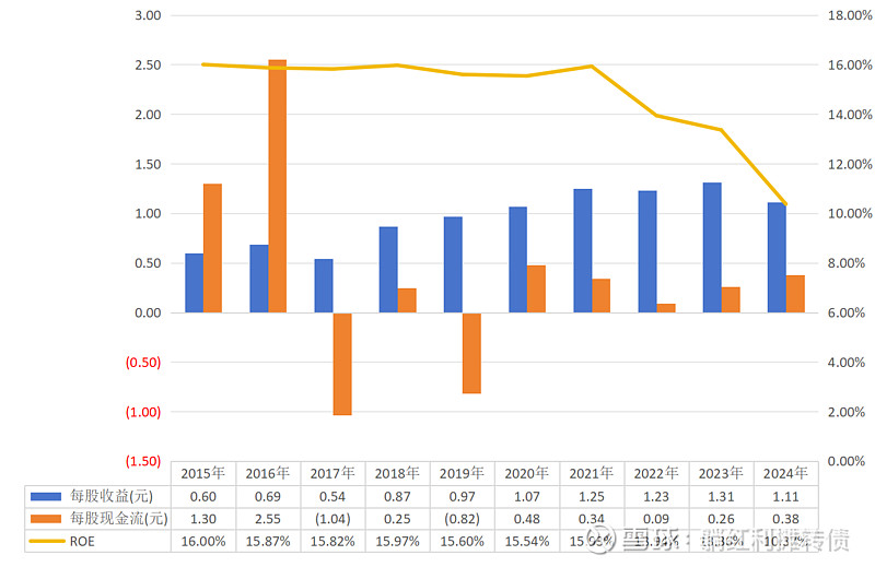 (1)每股收益表现相对稳定,只在17、24两个年度出现了净利润的下滑,十年间每股收益增长了85%;